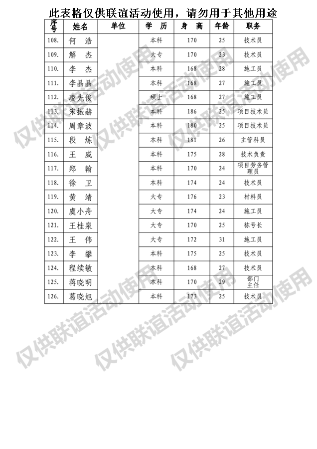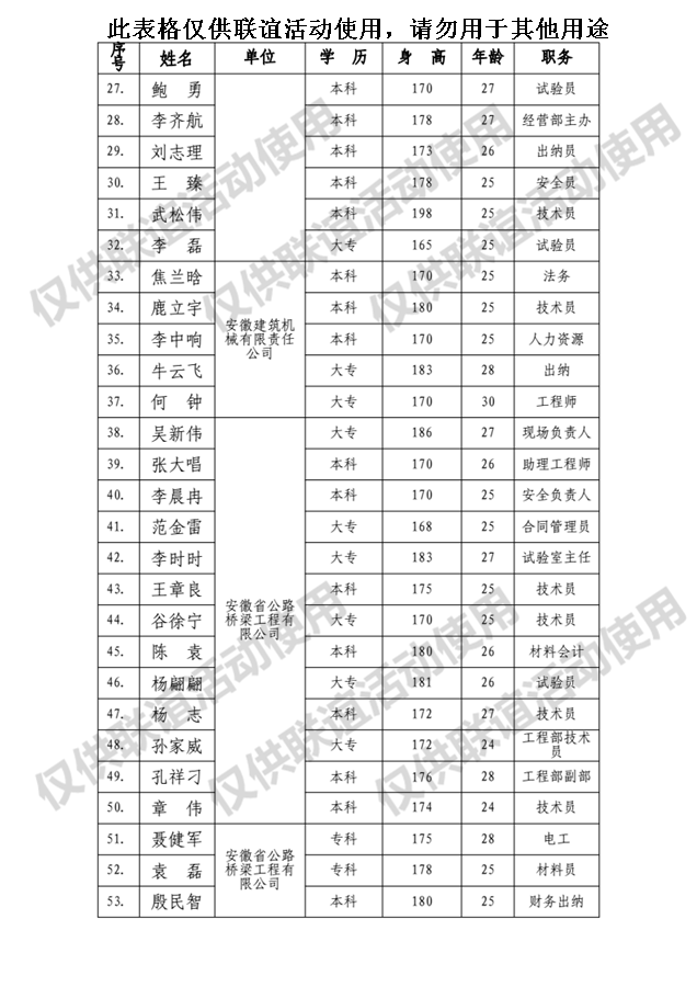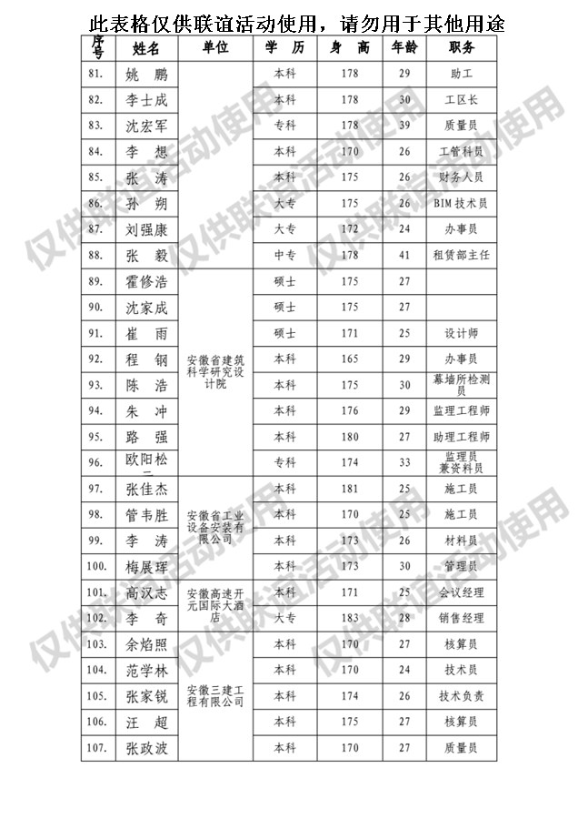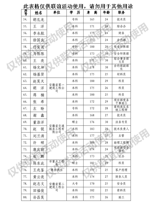 安徽建工集團未婚青年交友聯(lián)誼活動報名匯總表(男)