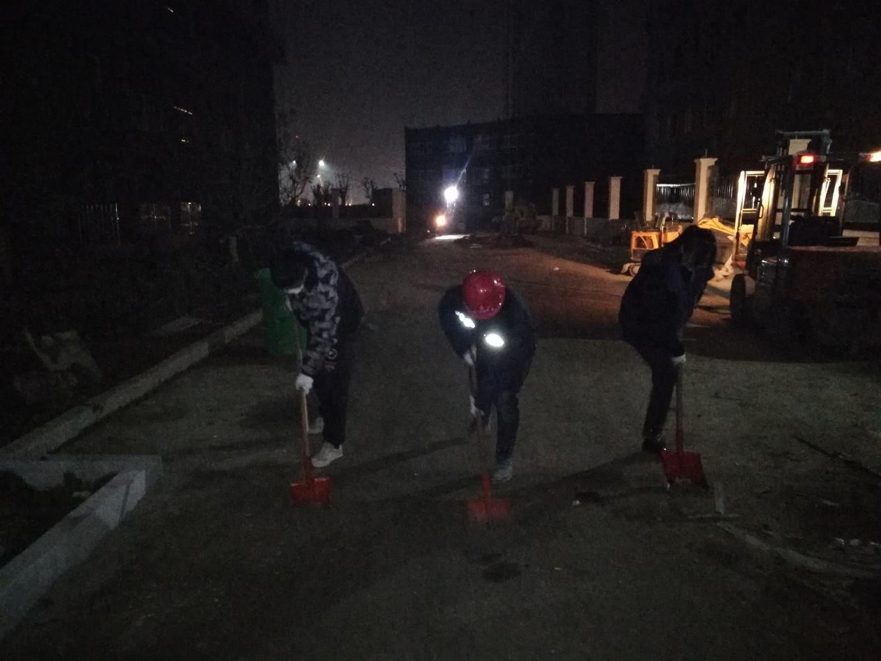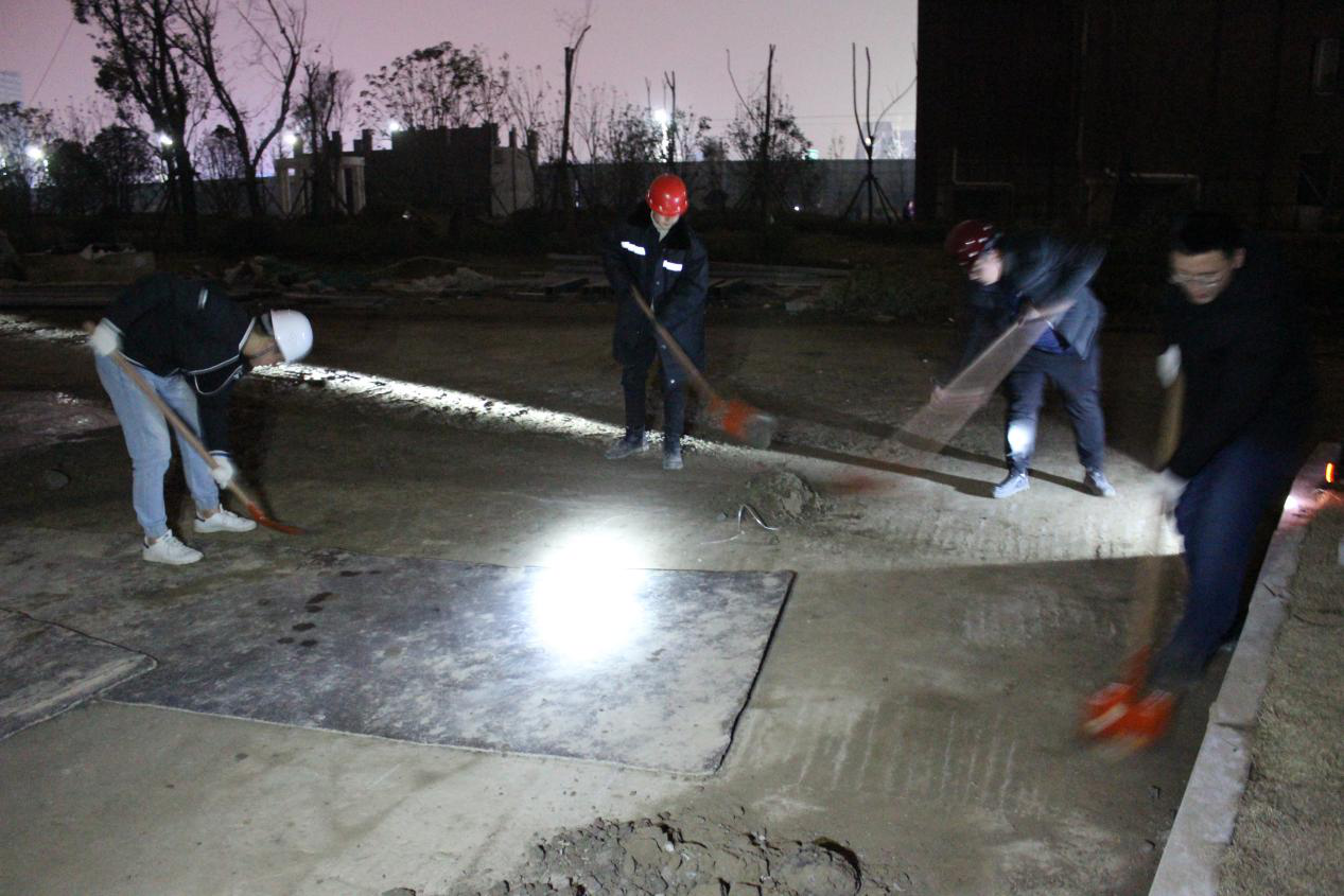 由于受到18年年末第一場雪的“洗禮”,積雪融化,導(dǎo)致項(xiàng)目內(nèi)的淤泥隨處可見,影響后期的施工進(jìn)度。為了實(shí)現(xiàn)白天夜晚交叉作業(yè),晚上六點(diǎn),阜陽公司黨支部書記、總經(jīng)理周鑫帶領(lǐng)全體黨員深入到泥土最多,工作難度較大的區(qū)域開展路面大清潔,并要求黨員亮明身份,積極發(fā)揮好先鋒模范作用。