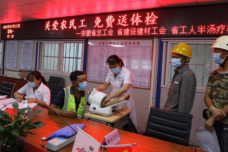 7月13日,由安徽省總工會(huì)組織,省建設(shè)建材工會(huì)、省工人半湯溫泉療養(yǎng)院承辦的“關(guān)愛(ài)農(nóng)民工、免費(fèi)送體檢”活動(dòng)來(lái)到了安徽三建合肥市中心圖書(shū)館項(xiàng)目,近120名現(xiàn)場(chǎng)農(nóng)民工參加了體檢。