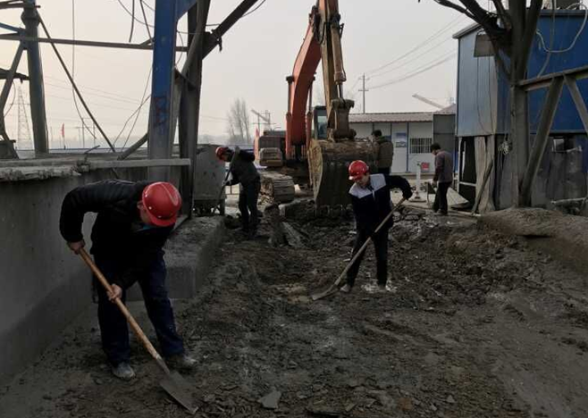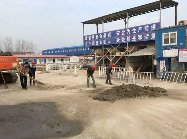 在后場的場站大門、分區(qū)隔離帶、拌合站等處,突擊隊(duì)員們有的掃、有的鏟、有的運(yùn)、有的推,個個干勁使足,有條不紊地對各處的塵土、淤泥、結(jié)塊混凝土進(jìn)行清理。