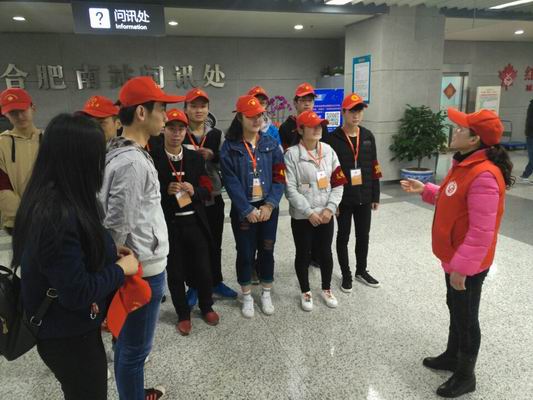 活動開展的三天里,我院學(xué)生每天準(zhǔn)時準(zhǔn)點(diǎn)到達(dá)合肥南站詢問處,在志愿者培訓(xùn)老師簡要介紹工作內(nèi)容以及要求后,同學(xué)們統(tǒng)一領(lǐng)取了帽子和袖章,走上了各自的服務(wù)崗位。