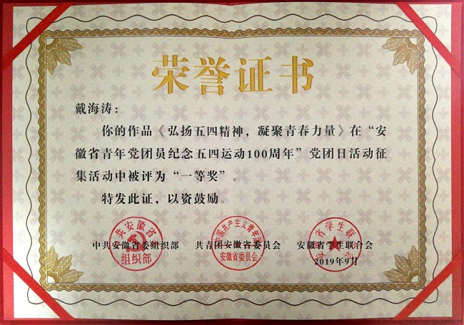 搭建文體活動平臺。今年是五四運動100周年,公司團委著眼新時代青年多層次、多方面、多樣化文化需求,先后組織“傳承五四精神,綻放青春風采”五四青年節(jié)活動、“傳承五四精神,緬懷革命先烈”紀念五四運動100周年活動、“青春心向黨,建功新時代”主題的演講征文等重大活動,各級團組織也分別組織了參觀革命圣地、重溫入團誓詞、觀看紅色電影等形式多樣、內容豐富、主題鮮明的文體活動,各類活動給公司青年提供了一個自由開闊的展示平臺,激發(fā)了青年員工參與自由創(chuàng)作、展現(xiàn)青春風采的主動性與積極性。其中公司團委選送的作品獲得安徽省“五四運動100周年”紅色信息征集評選活動一等獎。
