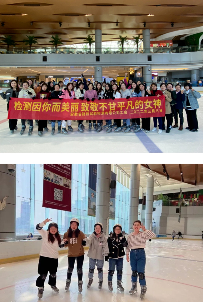 檢測公司組織母體全體女職工在合肥萬象城開展“檢測因你而美麗,致敬不甘平凡的女神”滑冰主題活動。女職工們從一開始的手扶圍欄、蹣跚滑稽的冰上行走,逐漸提高到進階技巧的緩緩滑行,大家在教練悉心的講解示范中逐步體會到滑冰的動作要領(lǐng),感受冰上運動帶來的歡樂。
