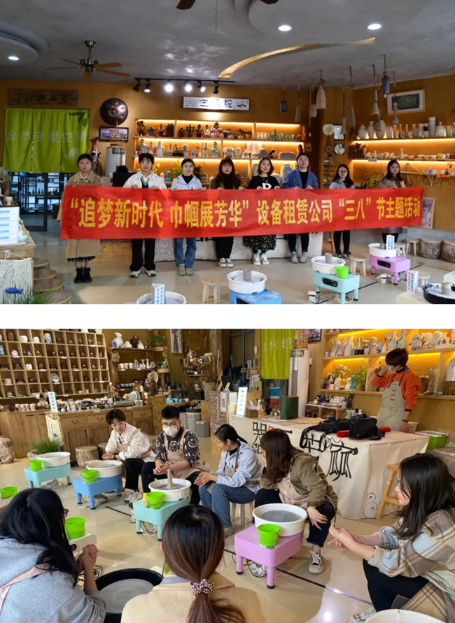 設(shè)備租賃公司組織女職工開展“追夢新時代,巾幗綻芳華”陶藝體驗創(chuàng)作活動。陶藝?yán)蠋煄е毠儏⒂^了工作室中的陶藝工藝品,介紹陶藝發(fā)展文化和制作過程。在老師的指導(dǎo)和幫助下,女職工們利用專業(yè)的拉胚機和定型工具,大膽發(fā)揮想象對泥料進行藝術(shù)創(chuàng)造,制作出了一件件別具匠心的陶瓷工藝品。