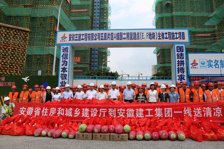 7月29日上午,省住房和城鄉(xiāng)建設(shè)廳黨組成員、副廳長陳揚(yáng)年帶領(lǐng)建設(shè)廳、省建材工會(huì)有關(guān)負(fù)責(zé)同志一行深入安徽建工集團(tuán)三建公司五里片區(qū)項(xiàng)目,看望慰問一線職工,開展“送清涼”活動(dòng)。廬陽區(qū)重點(diǎn)工程建設(shè)管理中心黨組書記、主任桑麗萍,安徽建工控股黨委委員、副總經(jīng)理陳仁虎,建工股份黨委副書記、建工控股工會(huì)副主席徐文聯(lián)以及安徽三建黨委書記、董事長何洪春陪同慰問。