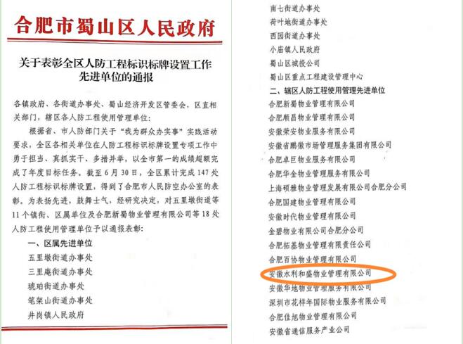 近日,集團(tuán)物業(yè)安徽水利和盛物業(yè)獲合肥市蜀山區(qū)人民政府通報(bào)表揚(yáng),榮獲合肥市蜀山區(qū)人防工程使用管理先進(jìn)單位稱號(hào)。
