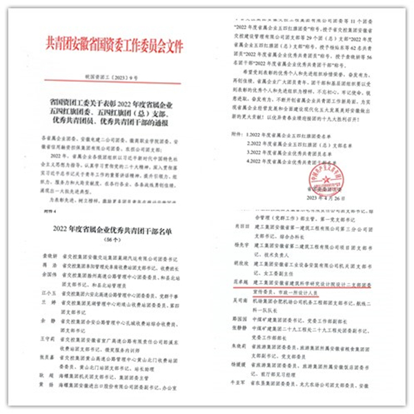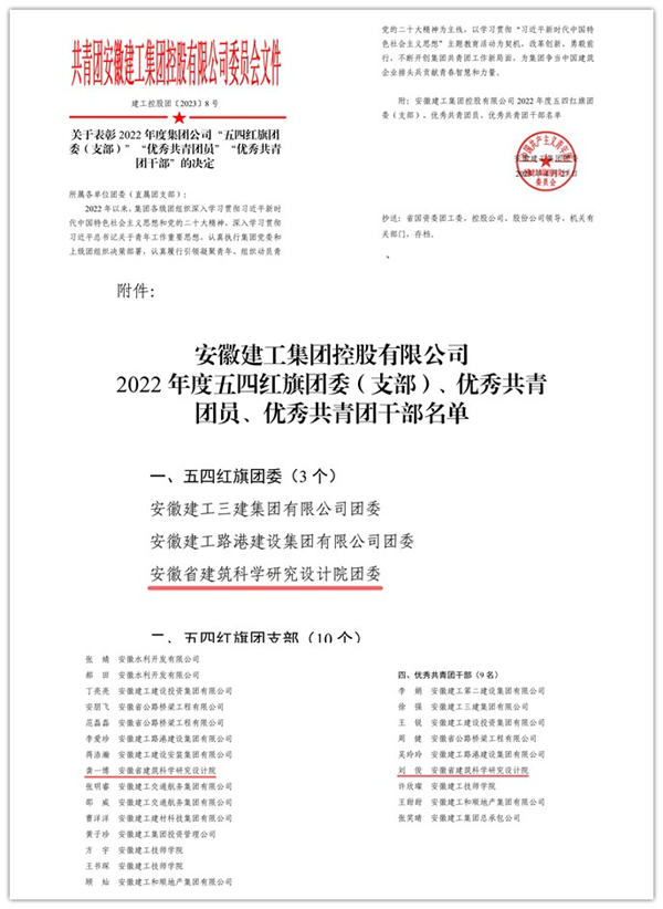 近日,省國資委團工委、建工集團團委相繼公布了2022年度省屬企業(yè)和安徽建工集團控股有限公司五四紅旗團委(團支部)、五四紅旗團(總)支部、優(yōu)秀共青團員、優(yōu)秀共青團干部名單,安徽省建科院1個集體、3名個人受表彰。