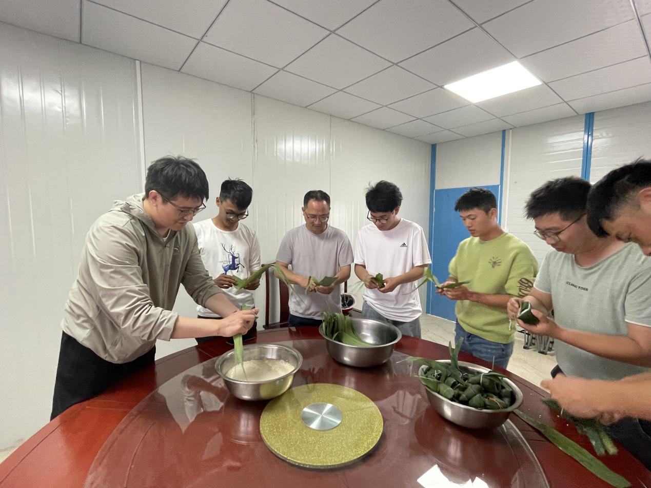 富有經(jīng)驗(yàn)的彭韋銘耐心細(xì)致地為大家講解了疊粽葉、填料、捆扎等包粽子的詳細(xì)流程。大家在一片歡聲笑語中開始了包粽子活動(dòng),將粽葉做成漏斗狀,填上糯米,壓實(shí)封口,最后捆扎。盡管大部分人都是第一次包粽子,但是大家熱情高漲,每個(gè)人包的粽子都有自己的特色。香噴噴的粽子,歡快的活動(dòng),緊張的生產(chǎn),使單調(diào)的工地生活增添了色彩。