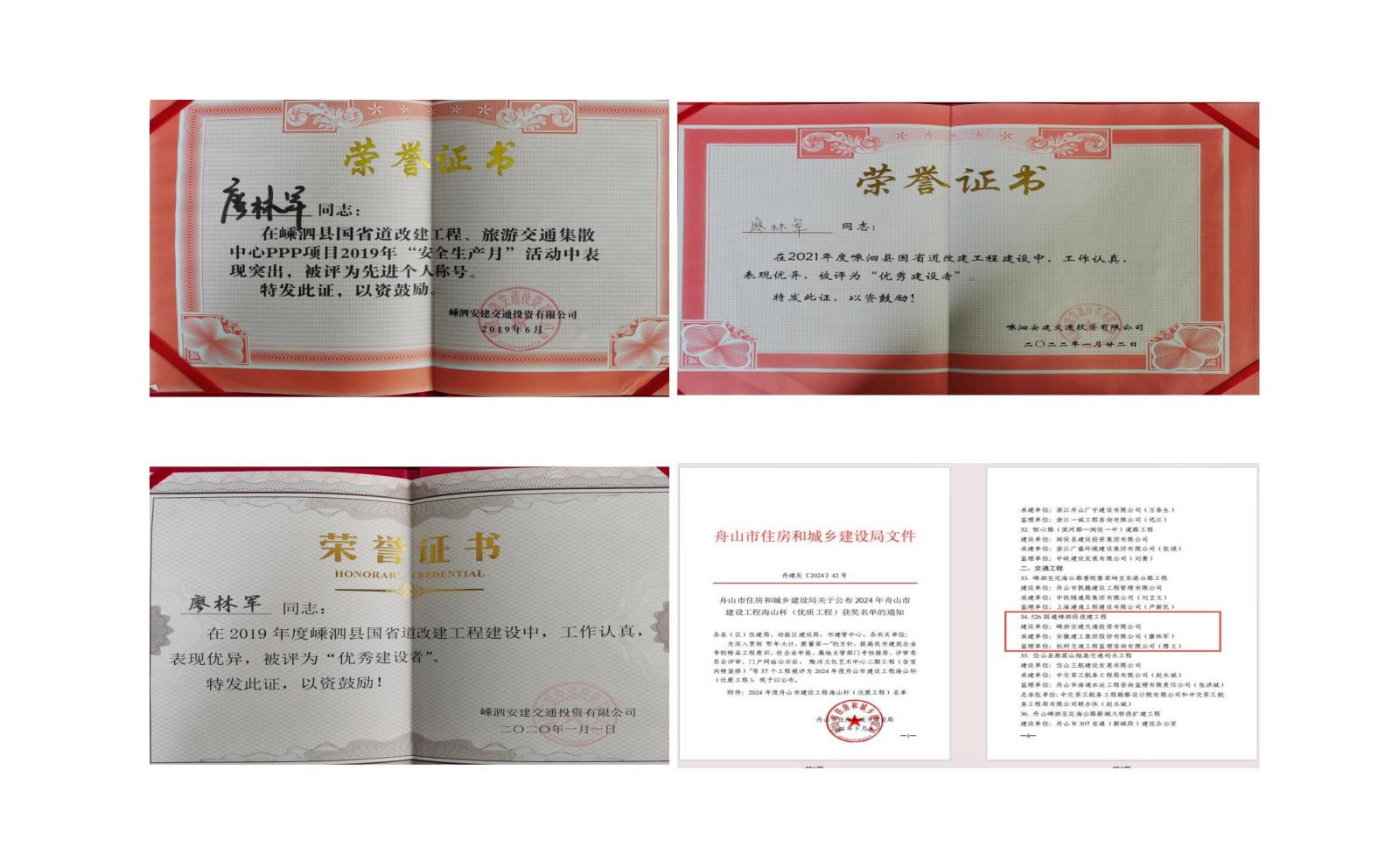 526國道嵊泗項目獲得了 2024 年舟山市建設工程海山杯(優(yōu)質(zhì)工程)獎,廖林軍也積累了豐富的施工管理經(jīng)驗,多次被項目公司評為“優(yōu)秀建設者”。