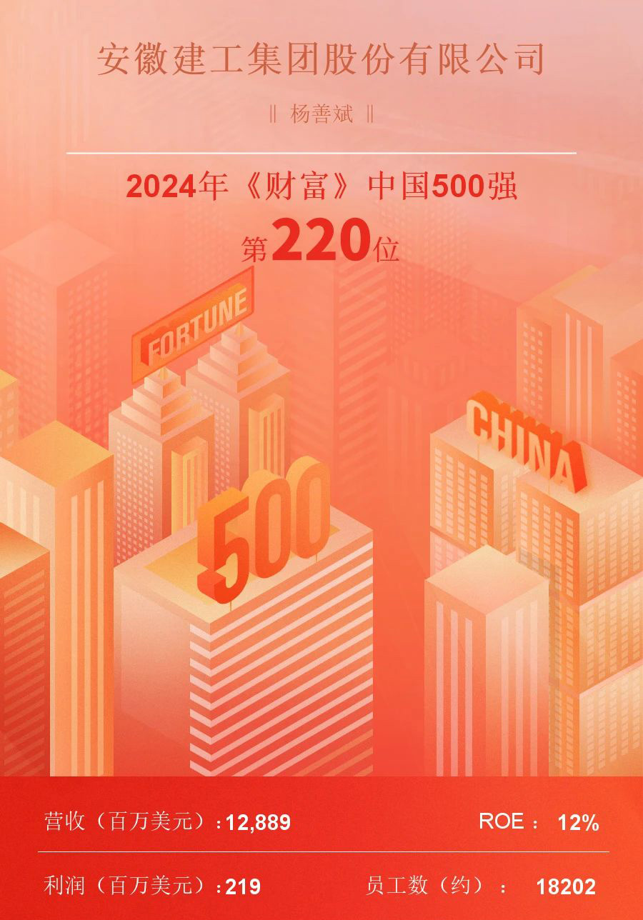 財(cái)富Plus APP于北京時(shí)間7月25日發(fā)布了2024年《財(cái)富》中國(guó)500強(qiáng)排行榜。安徽建工集團(tuán)股份有限公司以12,889.0百萬(wàn)美元的營(yíng)收名列第220位。