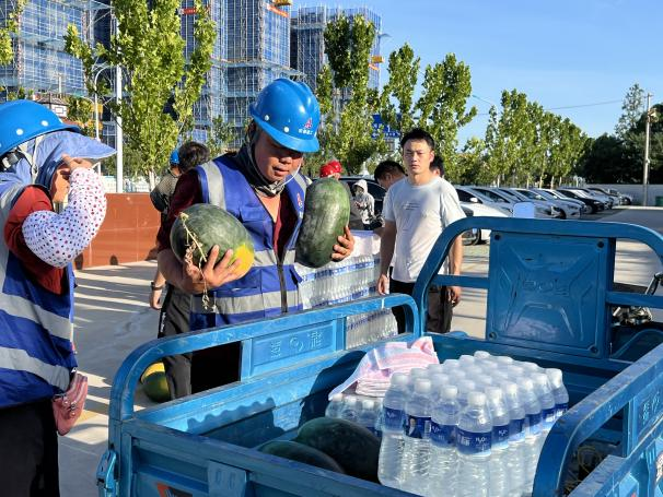 活動現(xiàn)場,項目部為現(xiàn)場一線工人代表送上了礦泉水、西瓜、藥品等防暑降溫物品,向他們表示親切問候,感謝他們一直以來的辛苦付出,叮囑他們在高溫天氣下要注意勞逸結合、做好防護,確保自身健康和安全。