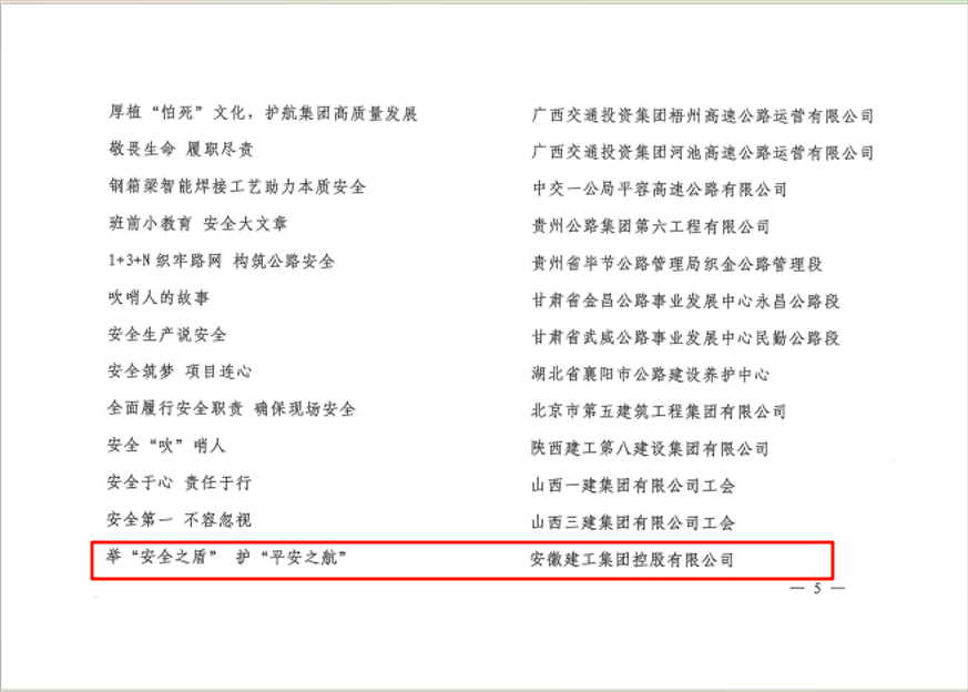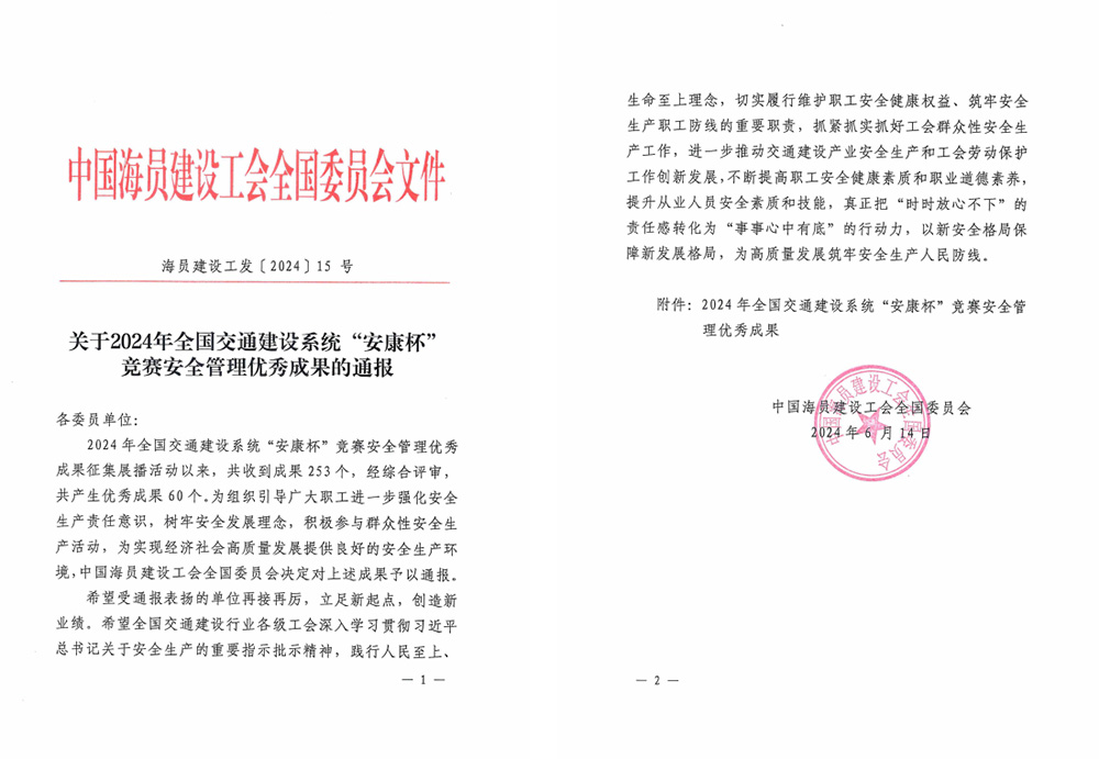 近期,中國(guó)海員建設(shè)工會(huì)全國(guó)委員會(huì)通報(bào)了2024年全國(guó)交通建設(shè)系統(tǒng)“安康杯”競(jìng)賽安全管理60項(xiàng)優(yōu)秀成果,由集團(tuán)公司和建工三建共同制作的視頻作品《舉“安全之盾” 護(hù)“平安之航”》,從全國(guó)交通建設(shè)系統(tǒng)的253項(xiàng)成果中脫穎而出,獲評(píng)“安康杯”競(jìng)賽安全管理優(yōu)秀成果。