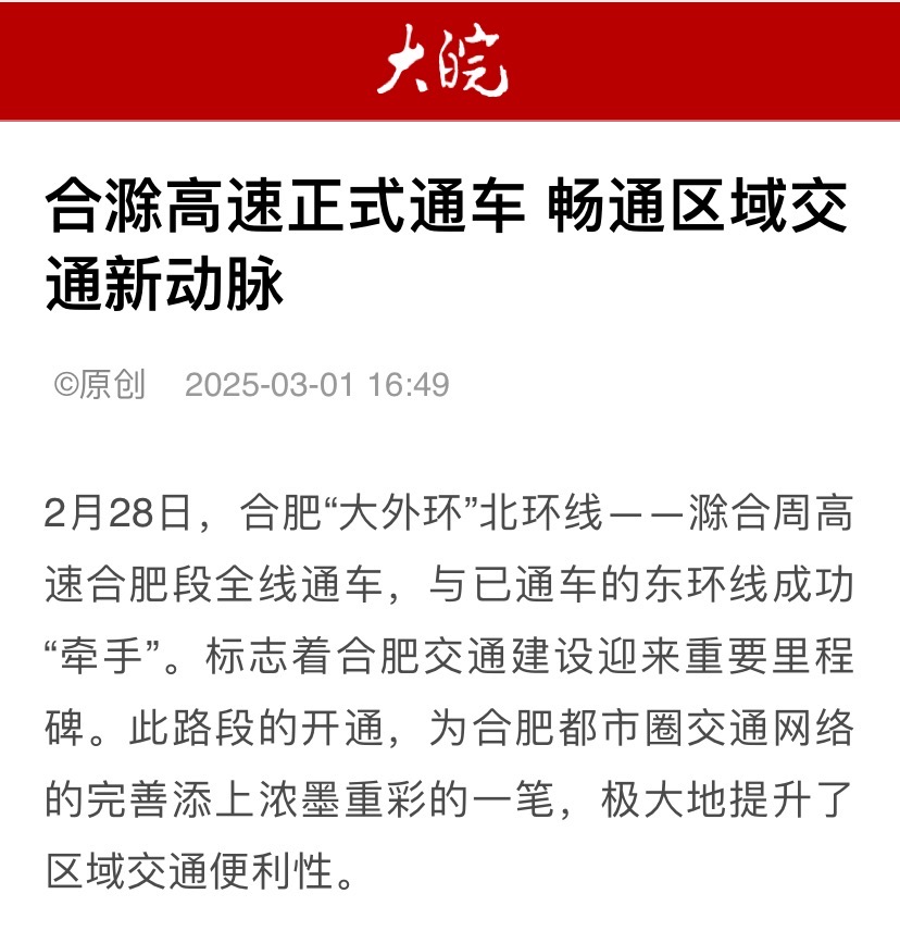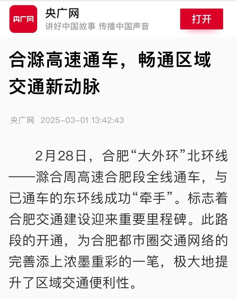 2月28日,建工水利承建的合肥“大外環(huán)”北環(huán)線——滁合周高速合肥段全線通車,與已通車的東環(huán)線成功“牽手”,受到央廣網(wǎng)、大皖新聞等主流媒體關(guān)注報(bào)道。