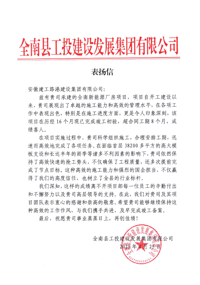 近日,建工路港收到江西省全南縣工投建設發(fā)展集團有限公司發(fā)來的表揚信,信中對公司在全南縣新能源產(chǎn)業(yè)園標準廠房及配套基礎建設項目中的出色表現(xiàn)予以高度肯定。