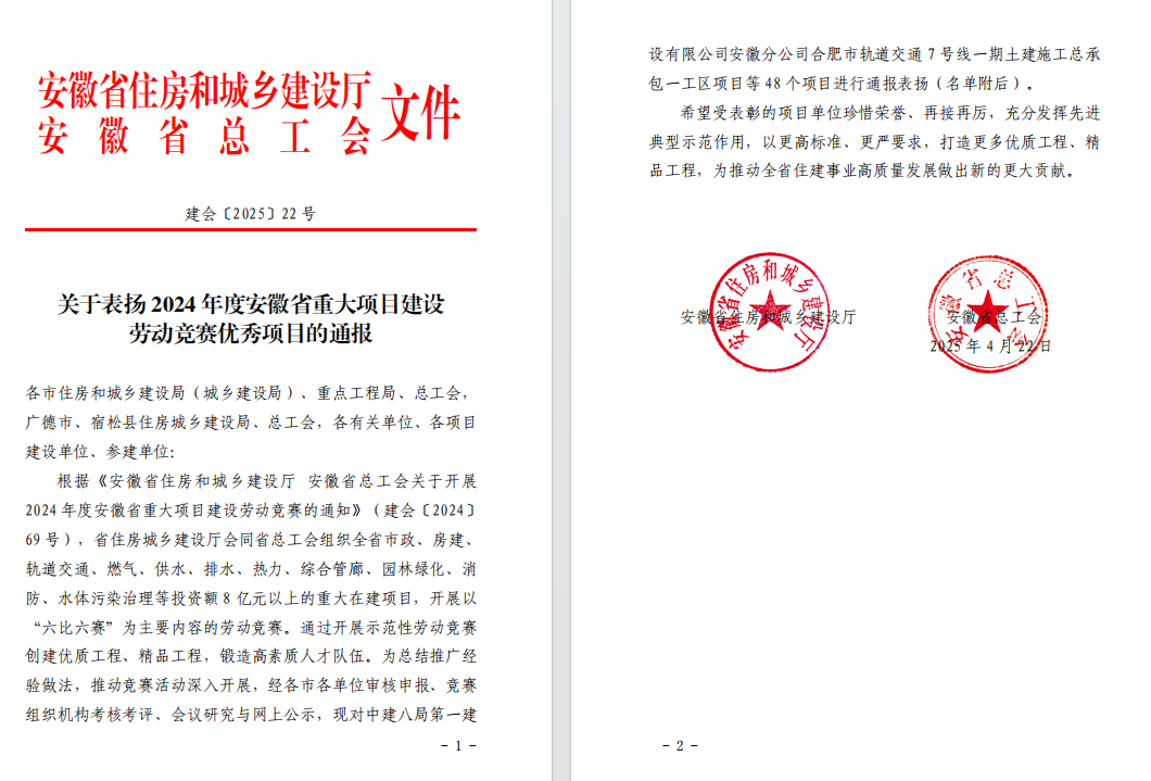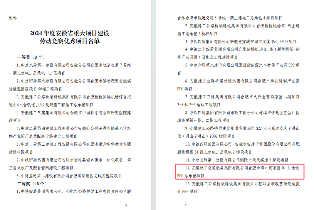 近日,安徽省住房和城鄉(xiāng)建設廳、安徽省總工會聯合發(fā)布《關于表揚 2024 年度安徽省重大項目建設勞動競賽優(yōu)秀項目的通報》,公司潭沖河家園 D、E 地塊 EPC 總承包項目和徐淮阜高速宿州段路基工程 02 標項目表現突出,成功入選優(yōu)秀項目名單。