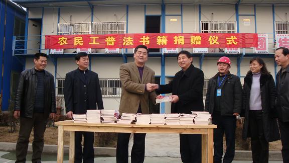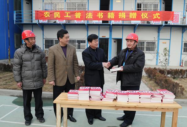 2010年元月28日下午,合肥市人民檢察院向安徽建工農(nóng)民工業(yè)余學(xué)校捐贈(zèng)農(nóng)民工普法書籍儀式在安徽三建美亞光電項(xiàng)目部舉行。市檢察院黨組成員、副檢察長黃世斌,黨組成員、政治部主任童興芝等一行四人,看望慰問農(nóng)民工兄弟,宣傳農(nóng)民工法律維權(quán)知識(shí),并現(xiàn)場捐贈(zèng)《農(nóng)民工普法讀本》200本。集團(tuán)公司副總經(jīng)理、集團(tuán)農(nóng)民工業(yè)余學(xué)校常務(wù)副校長王禮義,集團(tuán)人力資源部主任胡建英,安徽三建紀(jì)委書記周湃等出席捐贈(zèng)儀式。