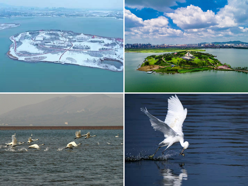 Now, Lujinhu (Green-gold Lake) Mining Area has taken on a new look with a contiguous lake surface of 11,600Mu (1Mu equals to 666.67 Square meters),the land resources have been restored and the living and ecological environment improved, biodiversity has increased. Within the scope of the project,there are 5 ecological islands, which provide habitats for more than 100 species of birds / animals and nearly 100 species of plants and the areas covered with trees and grasses planted reach tens of thousands of mu, - all these, have formed a veritable green lung for the city, playing a positive role in improving the microclimate in this region.