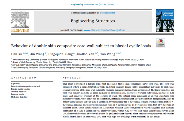 Research Finding titled as “Behavior of Double Skin Composite Core Wall subject to Biaxial Cyclic Loads” by structural and anti-seismic team of Anhui Province Key Laboratory of Green Building and Assembly Construction were published in the journal Engineering Structures, which is internationally renowned in the field of structural engineering with Impact Factor of 5.582. With Dr. Xu Dan as the first author, it is co-authored by Senior Engineer Mr. Xiang Bingquan, Research Mr. Wang Tao, Professor Yan Jiabao.